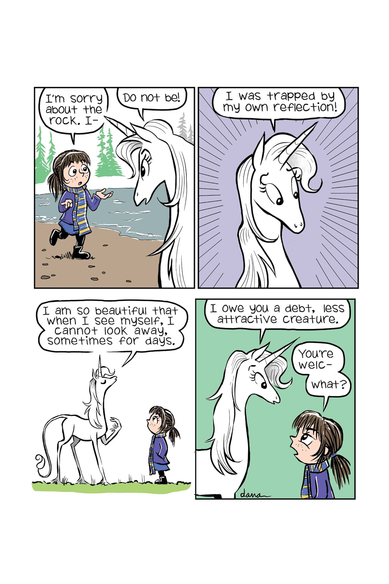 „Fibi i jednorożec” to w pewnym stopniu inspirowana cyklami tapiserii „Dama z jednorożcem” i „Polowanie na jednorożca” oraz animacją „Ostatni jednorożec” seria, która zadebiutowała w 2012 roku, jako cykl internetowych pasków komiksowych zatytułowany „Heavenly Nostrils”. Dwa lata później opowieść, pod tytułem jaki już znamy, pojawiła się w druku w formie albumów, a rok potem w ponad setce gazet. Za swoją pracę autor(ka) (Dana jest osobą transpłciową) została nagrodzona Washington State Book Award, Scandiuzzi Children’s Book Award w kategorii książka dla czytelników w wieku 9-12 lat (za pierwszy album) oraz PNBA Book Award (za album drugi).