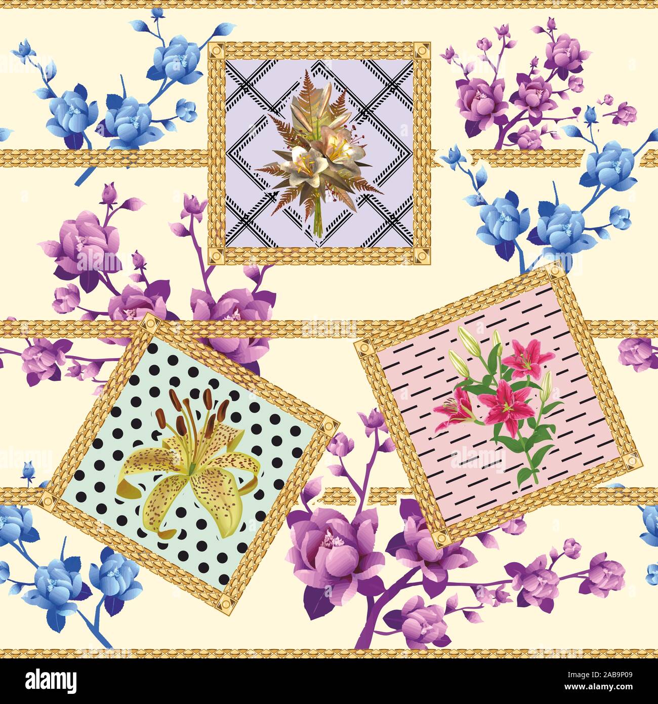 Vector Flowers Pattern With Golden Frames Floral Cute