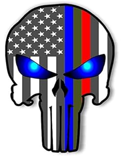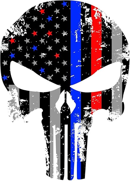 Red And Blue Tattered 4x3 Inch Subdued Us Flag Punisher Skull Reflective Decal With Thin Blue Line Police And Fire Support
